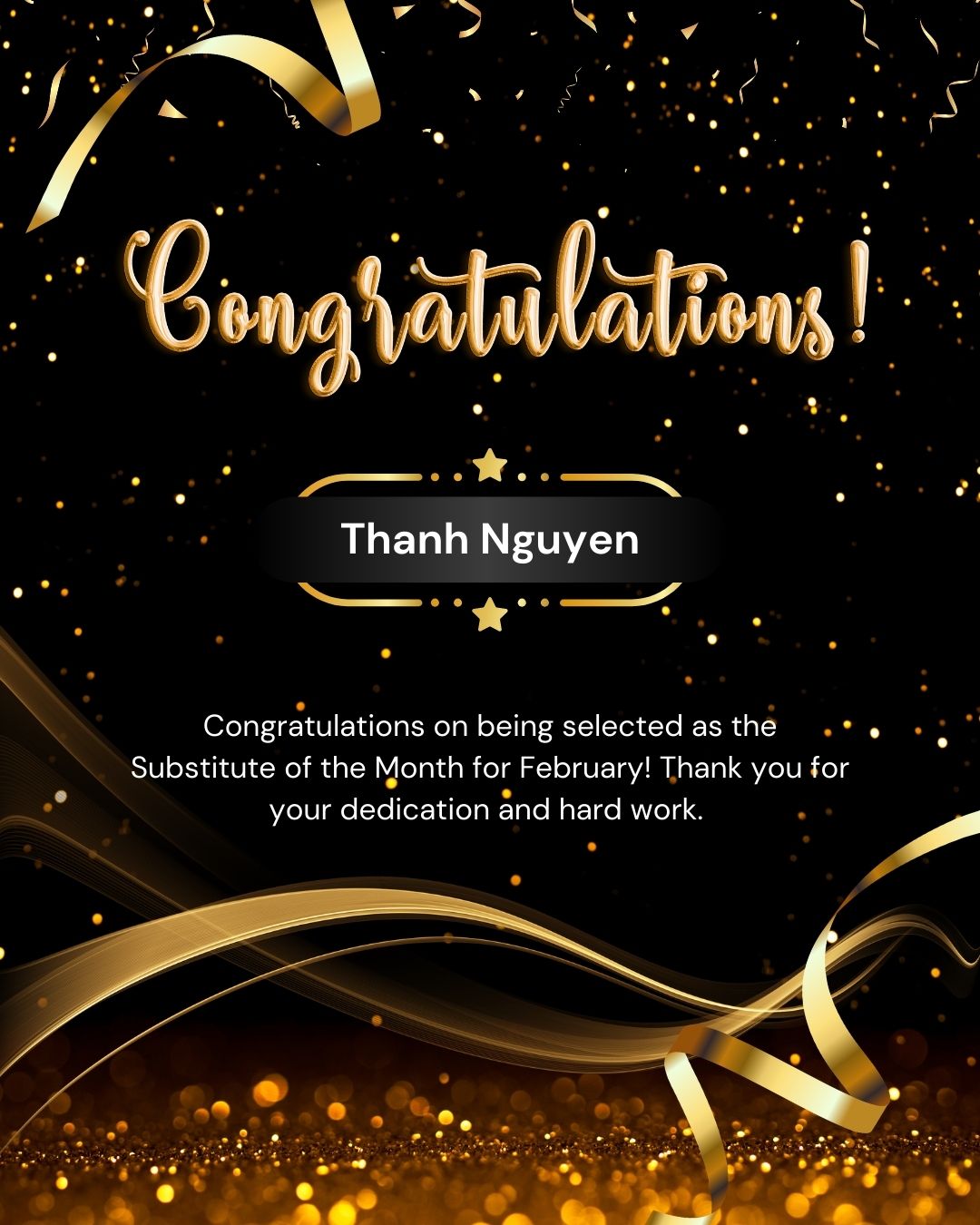 February's Substitute of the month is Thanh Nguyen! Here's what his staff had to say: Mr. Nguyen is a highly reliable long‑term substitute who builds strong relationships with students and provides consistent instructional and emotional support. His dedication, attentiveness to students’ needs, and willingness to go above and beyond make him an invaluable asset and vey deserving of Substitute of the Month. |