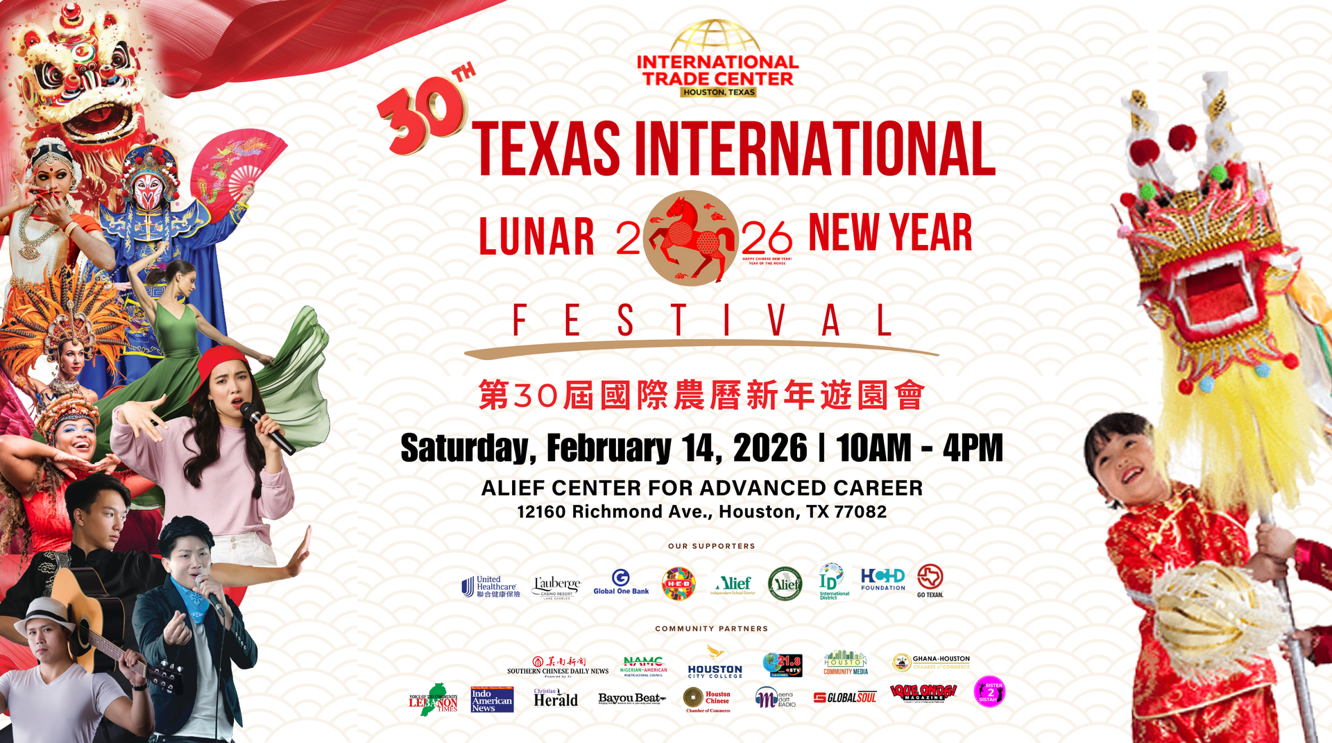 Join the International Trade Center and Alief ISD as we celebrate the 30th Texas Lunar New Year Festival! Lunar New Year marks a time of renewal, reflection, and hope as families and communities come together to welcome new beginnings. In 2026, we celebrate the Year of the Horse, a symbol of energy, strength, perseverance, and forward momentum. Those born under the Horse are often associated with leadership, optimism, and a strong sense of independence—qualities that inspire progress and determination. As we enter this new year, we wish our community good health, success, and continued growth, and we celebrate the rich cultural traditions that make Lunar New Year a meaningful and joyful occasion for all.
