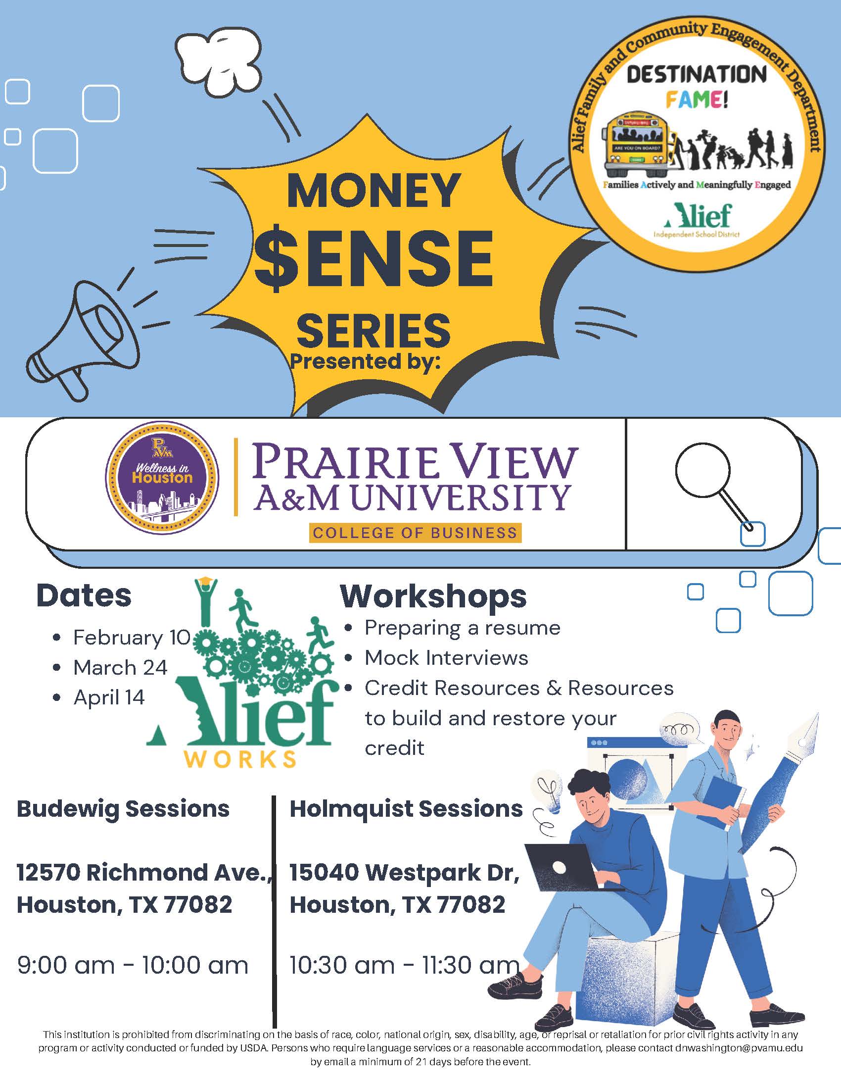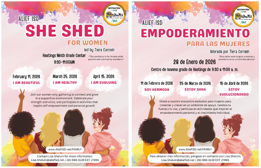 Alief families, save the date! Join us for the Alief Family U Conference on Saturday, February 28, 2026, from 8:00 a.m.–2:00 p.m. at the Alief Center for Talent Development. Enjoy FREE adult and staff workshops, informational sessions, community resources, pre-K–8th-grade child care, food, performances, and prizes—all designed to support and empower our families. |
